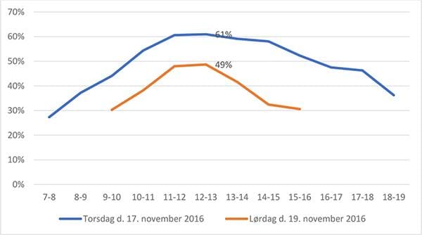 På figuren ses den samlede belægning fordelt over hele registreringsperioden for henholdsvis torsdag d. 17. og lørdag d. 19. november 2016.