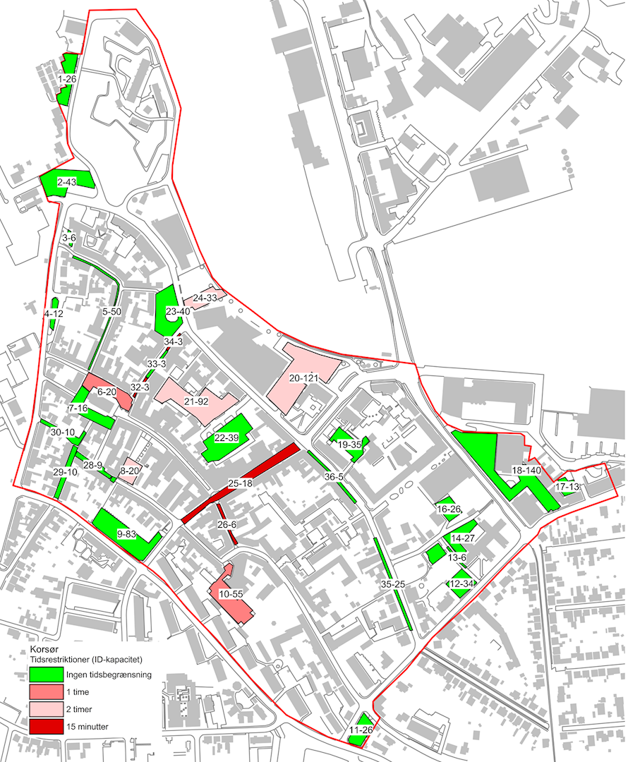 Fordelingen af de 1.076 offentlige parkeringspladser på deres tidsrestriktion..