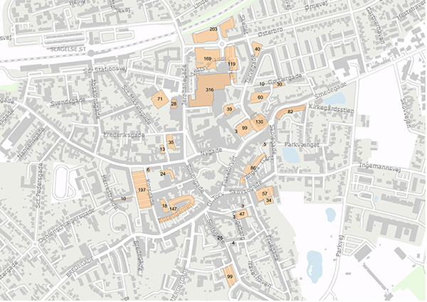 2.212 offentlige tilgængelige p-pladser i Slagelse midtby, heraf udgør privatejet parkeringspladser 43 %. Der er for hele området registreret en belægningsgrad på 81 % om torsdagen og 75 % om lørdagen.