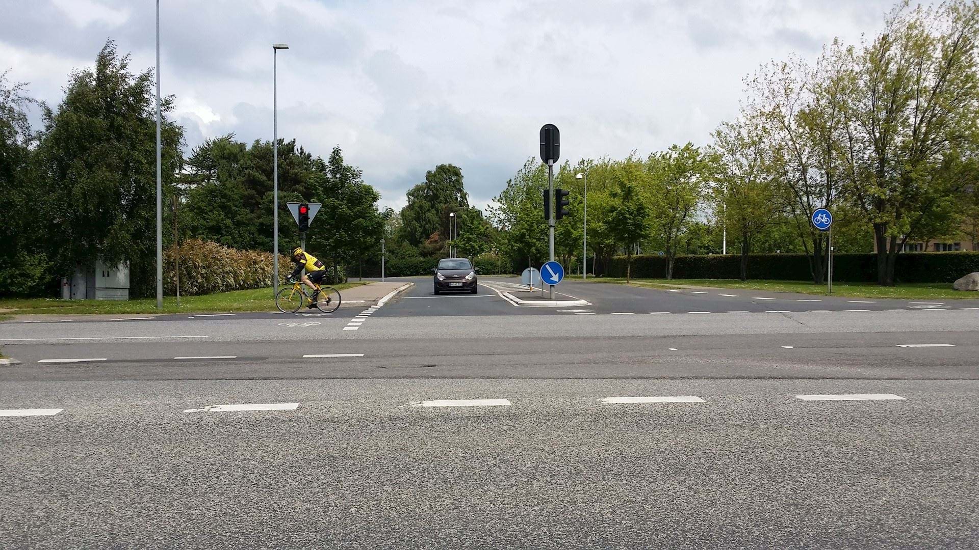 Cykelsignaler med før-grønt for cyklister/knallertkørere som skifter over til rødt for cyklister samtidig med at der er højresvingspil (højresving mod Næstvedvej.