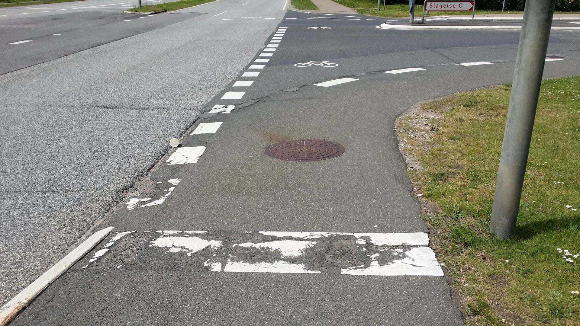 Faldt højresving fra Sdr. Ringgade mod Næstvedvej. Bilernes stoplinje er trukket ca. 5 m tilbage i forhold til cyklisternes stoplinje. Afmærkning trænger til genopfriskning.