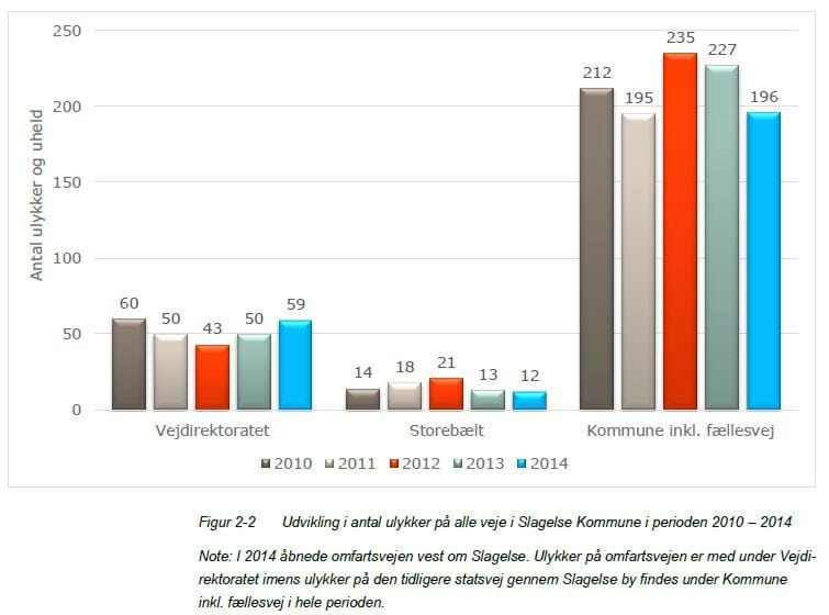 På kommunevejene varierer antallet af ulykker fra 195 i 2011 til 235 i 2013. Antallet i 2011 er nærmest den samme som i 2014. Ændringen fra 2010 til 2014 er et fald fra 212 til 196 svarende til 8%, samtidig med at der samlet set nærmest ikke var nogen ændring på Statsveje inkl. Storebælt.